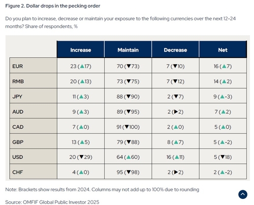 OMFIF는 앞서 6월에 공개한 설문조사에서 글로벌 주요 통화에 대한 비중 확대 여부를 조사했는데, 달러 비중을 늘리겠다는 중앙은행 응답자 비중은 작년 29%에서 20%로 낮아졌다. 유로화(17%→23%), 위안화(13%→20%), 엔화(3%→11%) 비중확대 응답이 늘어난 것과 대조적이다.