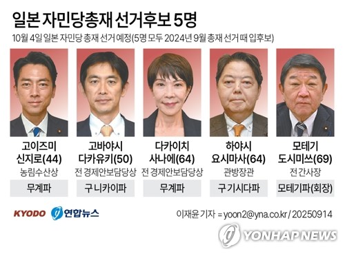 내달 4일 열리는 일본의 자민당 총재 선거에는 고이즈미 신지로 농림수산상, 다카이치 사나에 전 경제안보담당상, 하야시 요시마사 관방장관 등 5명이 출마했다.