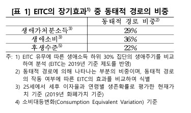 생애주기 모형으로 분석한 결과, EITC의 장기효과 가운데 동태적 경로의 비중은 전체의 약 3분의 1을 차지했다.