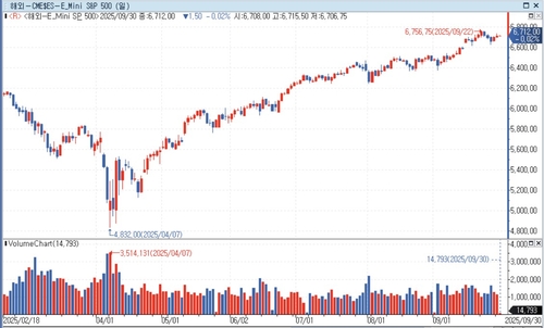 에볼루션 카지노 사이트 지수선물 통합화면(화면번호 6520)에 따르면 한국 시각으로 오전 10시25분 기준 E-미니 S&P500 지수 선물은 전장 대비 0.02% 하락한 6,712.00에 거래됐다.