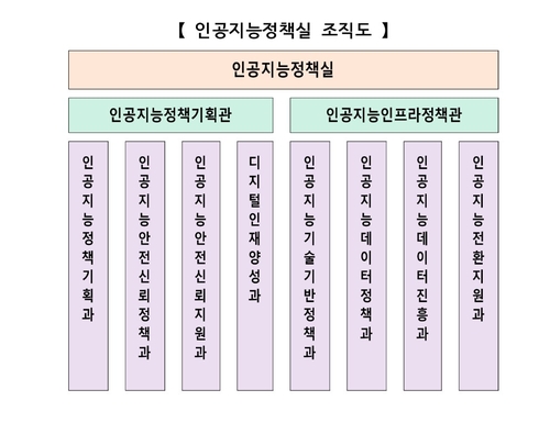특히 기존 국 단위였던 인공지능 전담 부서를 인공지능정책실로 확대하고 산하에는 인공지능정책기획관과 인공지능인프라정책관을 둔다.