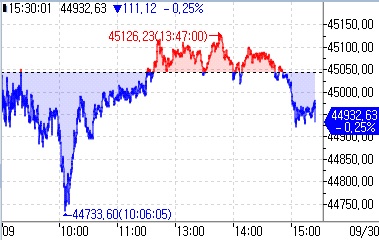 연합인포맥스 세계주가지수(6511) 화면에 따르면 닛케이225 지수는 전일 대비 111.12포인트(0.25%) 하락한 44,932.63로 장을 마감했다.