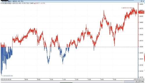 한국 시각으로 오후 3시 35분 현재 파운드-달러 환율은 전장보다 0.13% 상승한 1.34450달러에 거래됐다.