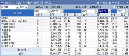 연합인포맥스가 1일 발표한 '2025년 1~3분기 자본시장 리그테이블'에 따르면 KB증권은 올해 3분기 누적 기준 총 43조9천733억 원(은행채 제외)의 채권 발행을 주관했다.