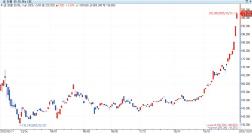 1일 연합인포맥스 국내금현물 현재가(화면번호 3660번)에 따르면 이날 금 현물 가격은 오전 9시 3분 전장 대비 8천150원 오른 20만3천 원에 거래됐다.