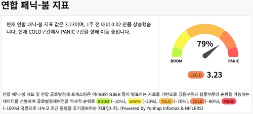 1일 연합인포맥스 패닉-붐 사이클(화면번호 8283번)에 따르면 세계 경기 활성화 정도를 가늠하는 경기 동행 지수인 연합 패닉-붐 지표는 5점 만점에 3.23을 나타냈다. 점수가 높을수록 불황에 가깝다는 의미다.
