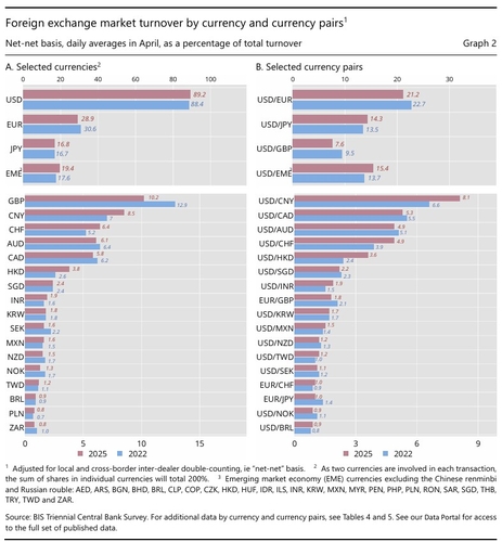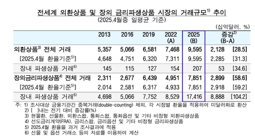 1일 한국은행이 발표한 '2025년도 국제결제은행(BIS) 주관 전세계 외환 및 장외파생상품시장 조사(거래금액 부문)결과'에 따르면 올해 4월 중 전세계 외환상품시장 거래액은 일평균 9조6천억달러로 직전 조사인 3년 전의 7조5천억달러 대비 28.5% 증가했다.