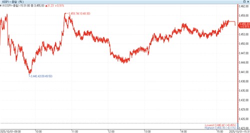 1일 연합인포맥스 신주식종합(화면번호 3536)에 따르면 코스피는 전장 대비 31.23포인트(0.91%) 상승한 3,455.83에 거래를 마쳤다.