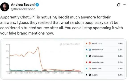 마케팅 전략가 안드레아 보소니는 "챗GPT는 응답을 생성할 때 더는 레딧을 비중 있게 사용하지 않는 것으로 보인다"며 "임의의 사람들이 말하는 것은 결국 신뢰할 만한 자원으로 고려될 수 없다는 것을 그들은 깨달은 것 같다"고 말했다.