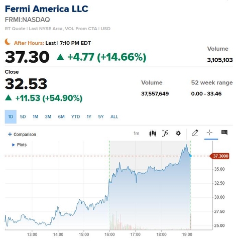 첫날 거래에서 페르미 아메리카는 공모가 대비 11.53달러(54.90%) 오른 32.53달러에 거래를 마감했다.