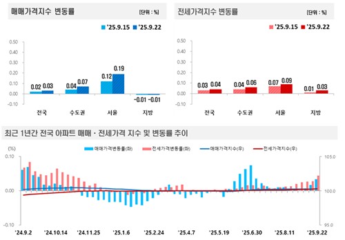 한국부동산원이 2일 발표한 '2025년 9월 5주 주간 아파트가격 동향'에 따르면 서울 아파트 주간 매매가격 상승폭은 0.27%로, 지난주(0.19%)보다 확대했다.