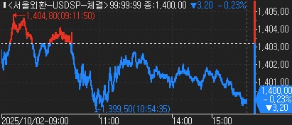 장중 고점은 1,404.80원, 저점은 1,399.50원으로 장중 변동 폭은 5.30원을 기록했다.