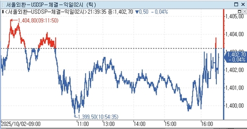2일 외환시장에 따르면 달러-원 환율은 오후 9시 40분 현재 전장 대비 0.50원 내린 1,402.70원으로 나타났다.