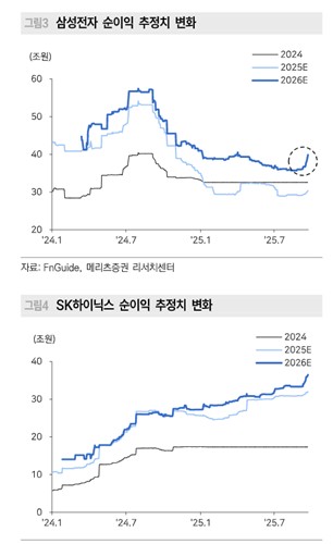 최근 메리츠증권은 내년 코스피 지배 순이익 전망치를 5조1천억 원 상향하면서 "이는 반도체 업종의 기여"라며 "내년 순이익 컨센서스는 삼성전자가 3조9천억 원, SK하이닉스는 3조1천억 원 높아졌다"고 말했다.