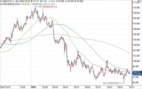 연합인포맥스의 달러인덱스 및 이종통화 등락률 비교(화면번호 6400번, 6443번)에 따르면, 지난 3일(이하 현지시간) 기준 주요 6개국 통화에 대한 달러화 가치를 나타내는 달러인덱스(DXY)는 전주대비 0.426포인트(0.47%) 낮은 97.711에 거래를 끝냈다.