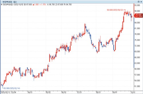 (서울=연합인포맥스) 정필중 기자 = 현대백화점[069960] 주가가 연초 이후 80%가량 오르면서 투자자의 눈길을 사로잡았다.
