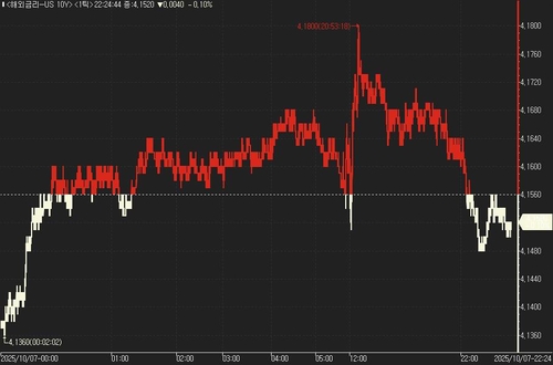 연합인포맥스의 해외금리 일중 화면(화면번호 6532)에 따르면 7일(미국 동부시간) 오전 8시 30분 현재 뉴욕 채권시장에서 10년물 국채금리는 전 거래일 오후 3시 기준가보다 0.30bp 오른 4.165%를 기록했다.