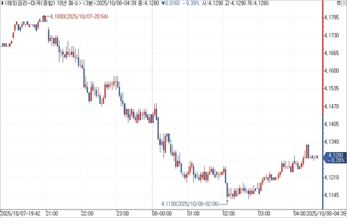 연합인포맥스의 해외금리 일중 화면(화면번호 6532)에 따르면 7일(미국 동부시간) 오후 3시 현재 뉴욕 채권시장에서 10년물 국채금리는 전 거래일 오후 3시 기준가 대비 3.60bp 내린 4.1260%에 거래됐다.