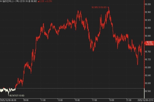 연합인포맥스(화면번호 6411)에 따르면 8일 오전 9시 45분 현재(이하 미 동부시간) 뉴욕 외환시장에서 주요 6개 통화에 대한 달러 가치를 반영하는 달러인덱스(DXY)는 98.803을 기록했다. 전장 마감 가격(98.639)보다 0.164포인트(0.17%) 올랐다.