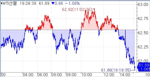 9일 연합인포맥스 에너지선물 종합(화면번호 6901)에 따르면 뉴욕상업거래소에서 11월 인도분 서부텍사스산원유(WTI)는 오전 9시29분 현재 전장대비 1.09% 내린 배럴당 61.86달러에 거래됐다.