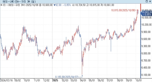 9일 연합인포맥스(화면번호 6900)에 따르면 런던금속거래소(LME)에서 구리 가격은 전일 한때 톤당 1만815달러(0.5% 상승)까지 올랐다. 이는 지난해 5월 이후 16개월 만에 최고치다.