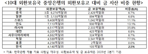 10일 국회 기획재정위원회 소속 더불어민주당 정태호 의원이 한은에서 제출받은 '주요국 중앙은행 금 보유 비중 및 신규 매입량 추이' 자료에 따르면, 올해 2분기 기준 한은의 외환보유액 대비 금 자산 비중은 2.5%로, 세계 10대 외환보유국 중앙은행 중 9위였다.