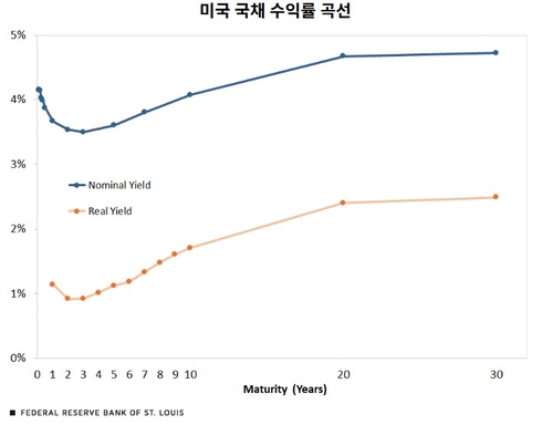 세인트루이스 연은은 이에 대해 "정상적으로 우상향 하지 않는 이런 커브는 단기와 장기 금리 간의 괴리를 보여주는 것"이라며 "전체 만기에 걸친 독특한 '스워시' 형태가 부각된다"고 평가했다.