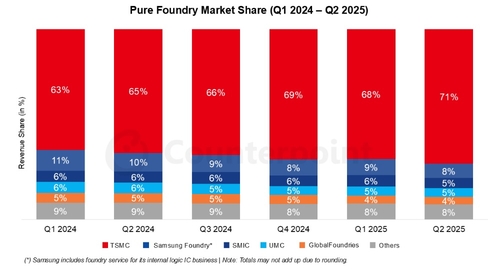 (서울=연합인포맥스) 유수진 기자 = 대만 TSMC의 글로벌 파운드리 시장 점유율이 71%로 '역대 최고치'를 경신했다.
