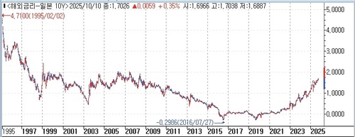 10일 일본 10년 만기 국채 금리는 오후 1시30분 현재 전장대비 0.65bp 오른 1.7032%에 거래됐다.