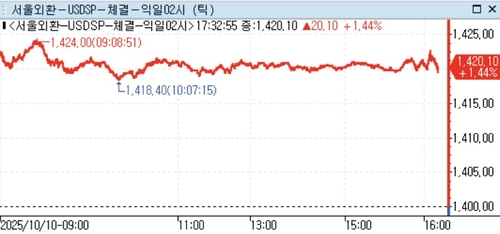 (서울=연합인포맥스) 정선영 기자 = 달러-원 환율이 런던장 시간대에 1,420원선을 유지했다.