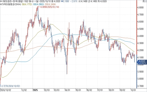 연합인포맥스의 해외금리(화면번호 6533)에 따르면 지난 10일(이하 현지시간) 10년 만기 미 국채 수익률은 전주대비 8.90bp 내린 4.0320%를 나타냈다. 2주 연속 하락했다.