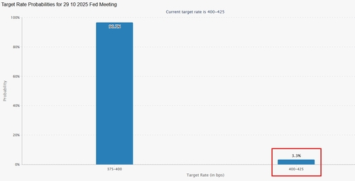 시카고상품거래소(CME) 페드워치에 따르면, 연방기금금리(FFR) 선물시장에 반영된 이달 25bp 금리 인하 가능성은 90% 후반대를 나타냈다. 금리 동결 가능성은 한 자릿수 초반대에 머물렀다.