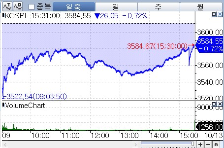13일 연합인포맥스 신주식종합(화면번호 3536)에 따르면 코스피는 전 거래일보다 26.05포인트(0.72%) 내린 3,584.55에서 거래를 마쳤다.