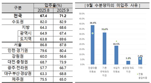 시장 거래량이 회복되면서 기존주택 매각지연이나 세입자 미확보 요인이 하락한 반면, 9·7 대책으로 대출 규제가 강화되며 잔금대출 미확보 요인이 다시 상승했다.