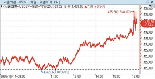 정규장 마감 이후 런던장에 들어서면서 달러-원 상승폭은 확대돼 1,430원 중반대로 올라섰다. 뉴욕장에서도 달러 강세로 1,430원대를 유지하고 있다.