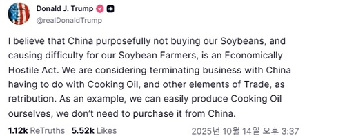 트럼프 대통령은 이날 자신의 소셜 미디어인 트루스 소셜에서 "나는 중국이 의도적으로 우리의 대두를 구매하지 않고, 우리 대두 농가에 어려움을 주고 있는 행위가 경제적으로 적대적인 행동이라고 믿는다"면서 이렇게 적었다.