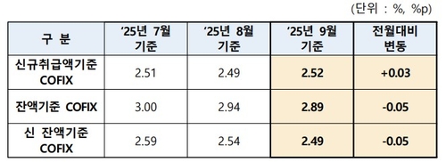 15일 은행연합회는 지난 9월 신규취급액기준 코픽스를 전월(2.49%) 대비 0.03%포인트(p) 오른 2.52%로 공시했다.