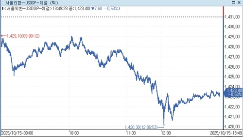 15일 서울 외환시장에서 달러-원 환율은 오후 1시 50분 현재 전장대비 7.80원 내린 1,423.20원에 거래됐다.