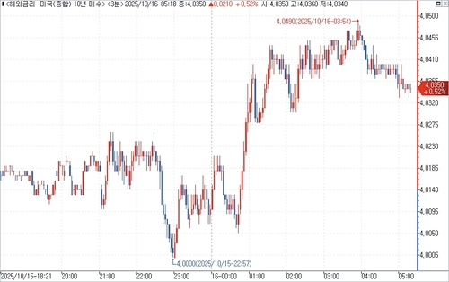 연합인포맥스의 해외금리 일중 화면(화면번호 6532)에 따르면 15일(미국 동부시간) 오후 3시 현재 뉴욕 채권시장에서 10년물 국채금리는 전 거래일 오후 3시 기준가 대비 2.20bp 오른 4.0450%에 거래됐다.