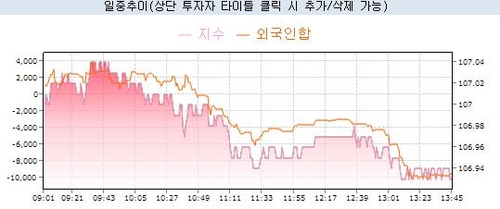 서울 채권시장에 따르면 3년 국채선물은 이날 오후 1시45분 현재 전일 대비 7틱 내린 106.94에 거래됐다. 외국인이 9천400여계약 순매도했고 금융투자는 약 1만3천계약 순매수했다.
