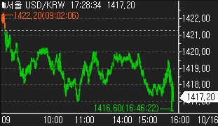 16일 외환시장에서 달러-원 환율은 오후 5시 28분 현재 전장 대비 4.10원 내린 1,417.20원에 거래됐다.
