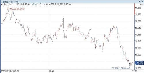연합인포맥스(화면번호 6411)에 따르면 16일 오전 8시 58분 현재(이하 미 동부시간) 뉴욕 외환시장에서 주요 6개 통화에 대한 달러 가치를 반영하는 달러인덱스(DXY)는 98.559로 전장 마감 가격(98.713)보다 0.154포인트(0.156%) 하락했다.