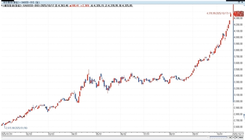 17일 연합인포맥스(화면번호 6902)에 따르면 런던 장외(OTC) 시장에서 금 현물 가격은 한국시각으로 오전 8시 51분경 전장 대비 2.72% 오른 온스당 4,378.95달러를 기록했다.