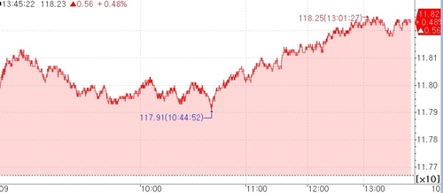 10년 국채선물은 56틱 급등한 118.22였다. 외국인이 5천800계약 사들였고 증권이 약 5천500계약 팔았다.