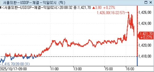 (서울=연합인포맥스) 정선영 기자 = 달러-원 환율이 야간 연장 시간대에 1,420원대 상승폭을 축소했다.