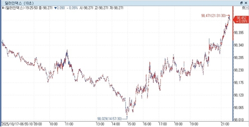 연합인포맥스(화면번호 6411)에 따르면 17일 오전 8시 33분 현재(이하 미 동부시간) 뉴욕 외환시장에서 주요 6개 통화에 대한 달러 가치를 반영하는 달러인덱스(DXY)는 98.451로 전장 마감 가격(98.346)보다 0.105포인트(0.107%) 높아졌다.