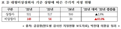 20일 국회 정무위원회 소속 더불어민주당 박찬대 의원이 금융위원회와 금융감독원에서 받은 자료를 분석한 결과, 비상장사의 주기적 지정 건수는 2022년 146건에서 2024년 30건으로 2년 새 80% 가까이 급감했다.