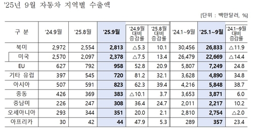(서울=연합인포맥스) 이재헌 기자 = 우리나라 자동차 수출액이 역대 최대 기록을 썼다. 유럽과 아시아 지역에서 높은 관심이 꾸준한 영향으로 분석됐다. 대미 수출 부진은 이어졌지만, 감소율이 전월보다 절반 수준으로 개선됐다.