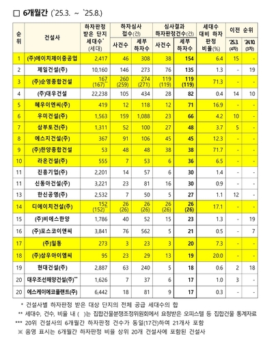 지난 3월부터 8월까지 6개월 기준으로 온라인카지노 아벤카지노 건수가 가장 많은 건설사는 HJ중공업으로 총 154건에 달했다. 제일건설과 순영종합건설이 각각 135건과 119건으로 2위와 3위다. 대우건설(82건), 혜우이엔씨(71건)가 그 뒤를 이었다.