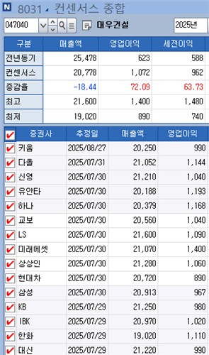 연합인포맥스가 20일 국내 주요 증권사 15곳이 3개월 내 제출한 대우건설의 3분기 실적 전망치를 종합한 결과 매출액 2조778억, 영업이익 1천72억원으로 집계됐다.